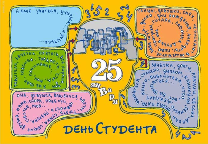У студента каждый день – праздник. В период от сессии до сессии, как известно, повода для веселья долго искать не приходится. Но 25 января – особый случай. В этот день под покровительством Св. Татьяны все российское студенчество официально отмечает свой «профессиональный» праздник. Будущие учителя и медики, инженеры-строители, политологи, менеджеры и автослесари 25 января учатся (вернее, не учатся) по одной программе. И наш раздел в этом, надеемся, станет хорошим подспорьем. Студенческий юмор, поздравления с Днем студента в стихах и прозе, прикольные и лиричные, почти наверняка будут поняты на любом факультете, где есть экзамены, зачетки и их не выспавшиеся обладатели.